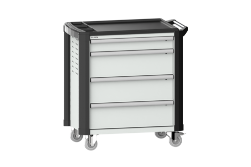 Verktygsvagn i premiumkvalitet från LISTA. Vagnen är tillverkad i en kraftig plåtkonstruktion av allra högsta klass och ett topplan i formpressad plast för användning i krävande miljöer. Utrustad med fyra utdragbara lådor som har en lastkapacitet på 40 kg, lådspärr och centrallås med tillhörande nyckel. Total lastkapacitet 400 kg. Både stommen och lådorna är lackerade i ljusgrå RAL 7035. Toppskivan i ABS har även en antiglidmatta och mindre fack för smådelar. Vagnen har hörnskydd i svart ABS.