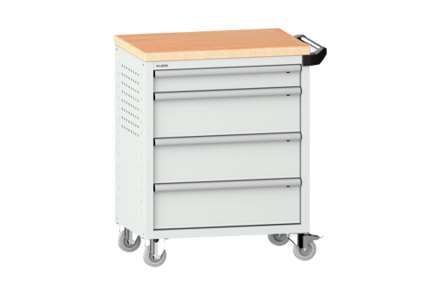 Verktygsvagn i premiumkvalitet från LISTA. Vagnen är tillverkad i en kraftig plåtkonstruktion av allra högsta klass och har en toppskiva i 40 mm multiplex för användning i krävande miljöer. Utrustad med fyra utdragbara lådor som har en lastkapacitet på 40 kg, lådspärr och centrallås med tillhörande nyckel. Total lastkapacitet 400 kg. Både stommen och lådorna är lackerade i ljusgrå RAL 7035. Toppskivan har en slät yta som är behandlad med olja och vax.