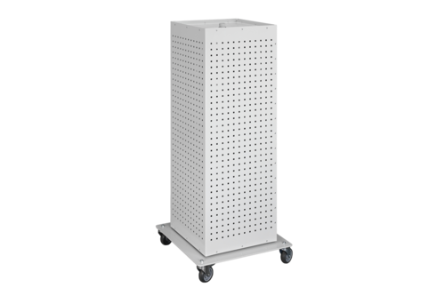 Snurrbar och mobil verktygstavla för flexibel verktygsupphängning. Verktygstavlan är fyrsidig med perforerad panel och skapar stort förvaringsutrymme på en liten yta, samtidigt som den är enkel att flytta runt eller få undan när den inte används. Här har ni möjlighet att skapa en bra överblick över era verktyg och anpassa upphängningsytan med de krokar och tillbehör som ni behöver. Hela verktygstavlan går att rotera tack vare kullager i botten och en bottenplatta i 8 mm kraftig plåt som är försedd med fyra hjul, varav två med broms.