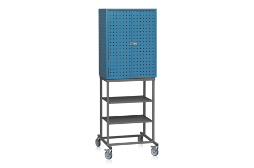 Verktygsvagn med ett perforerat överskåp (höjd 800, bredd 600 och djup 400 mm). Låsning med spänne för hänglås. Underdel tillverkad av kraftiga fyrkantsrör. Levereras med botten- och mellanhyllplan.