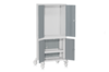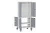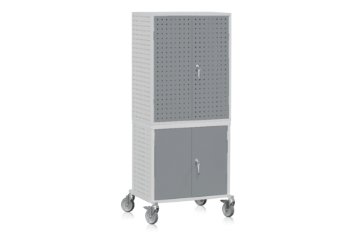 Mycket kraftig verktygsvagn för industriella miljöer och arbetsplatser. Perforerat överskåp med ett dörrpar, l-handtag och spanjolettlåsning. Underrede med fyra länkhjul (hjuldiameter 125 mm), varav två med broms. Rörram försedd med bottenhyllplan, underskåp med perforerade sidoplåtar och dörrpar med l-handtag och spanjolettlåsning. Öppningsmått: bredd 640 mm och höjd 580 mm. Levereras med utdragbar hylla som kan användas från båda håll: bredd 615 mm och djup 440 mm. Lackerat grått i två nyanser, den mörka nyansen på dörrarna för att minska risken för smuts och fingeravtryck. Maximal belastning är 150 kg fördelad vikt.