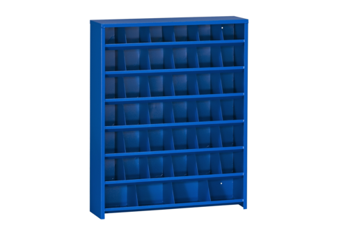 Bultfack av plåt med 40 stycken verktygsfack. Blålackerat, RAL 5005. Kan hängas upp på vägg.