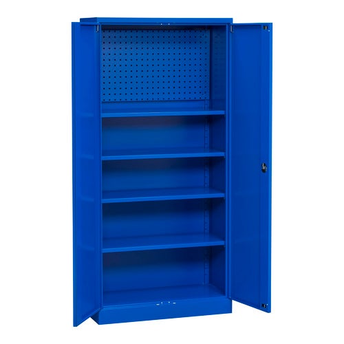 Ett robust verkstadsskåp tillverkat i en helsvetsad konstruktion av stålplåt. Passar för krävande miljöer såsom verkstäder och lager men det lämpar sig även som kontors- eller arkivskåp. Skåpet är utrustat med justerbara fötter så att det står stadigt även på ojämna underlag. Levereras inklusive 4 hyllplan. Maximal belastning per hyllplan är 40 kg eller maximalt 300 kg per skåp. Blåfärgat, RAL 5005.
