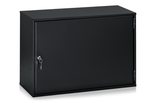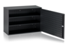 Praktiskt skåp med två flyttbara hyllplan. Kan monteras på perforerade pelare med 670 mm/cc alternativt skruvas direkt på vägg. Krokar för pelarupphängning bifogas.