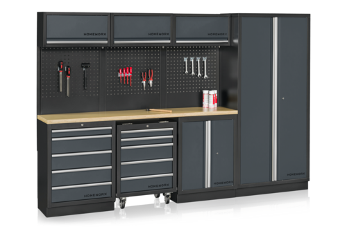 Garageinredning Homeworx Deluxe Grey består av tre överskåp med gasfjädrar för mjuk öppning och stängning, tre perforerade väggpaneler, en bänkskiva i träfiber, ett underskåp med fem lådor, en flyttbar verktygshurts med fem lådor, ett underskåp med dörrar och ett högskåp. Lådorna har kullagrade expansioner. Högskåpet kan monteras på valfri sida och har måtten: 2000 mm hög, 915 mm bred och 458 mm djup. Höjd på arbetsbänken är 95 cm och djupet 500 mm.