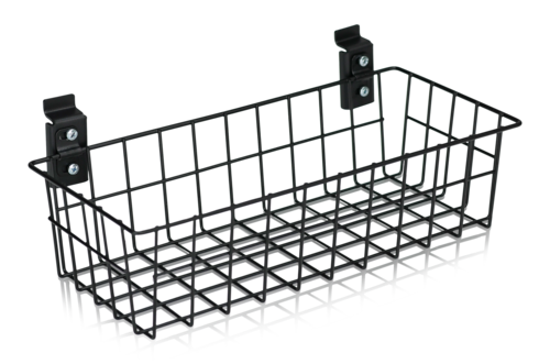 Svartlackerad trådkorg. Trådkorgen passar vår garageinredning med spårpanel som har en aluminiumskena för upphängning av tillbehör, perfekt för att utöka förvaringsmöjligheterna i såväl garage som verkstad.