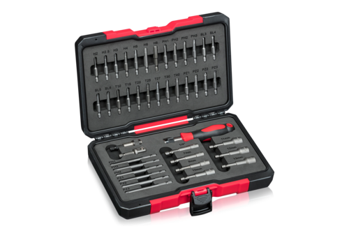Hyls- och bitssats i 42 delar med hylsor, bits och tillbehör för olika sorters skruvhuvuden och muttrar.