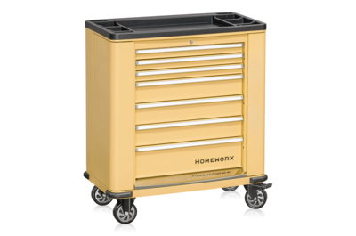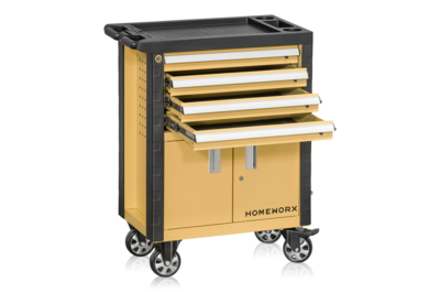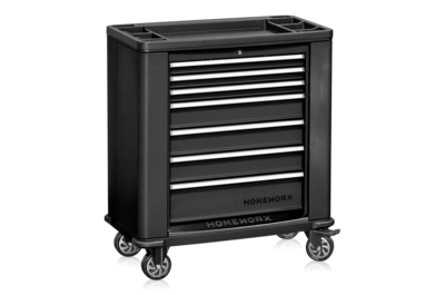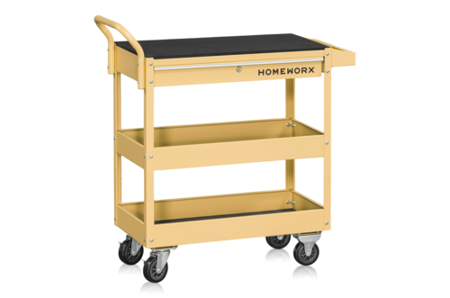 Verkstadsvagn Homeworx är en smidig vagn på hjul att flytta med vid montering. Vagnen är tillverkad i pulverlackerad metall och har tre hyllplan.
