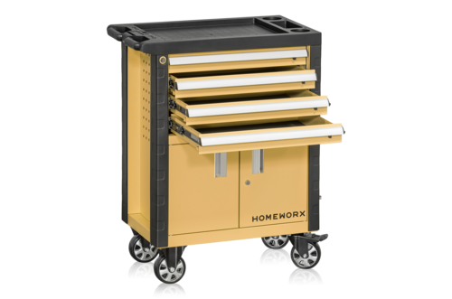 Förvara dina befintliga verktyg och redskap i Verktygsvagn X1-0 från Homeworx. Med utdragningsbara lådor och ett underskåp med två dörrar får du gott om förvaring för dina handverktyg, batteridrivna verktyg och kemikalier.