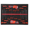 Verktygen av kromvanadinstål är snyggt sorterade i skumgummi-inlägg med bestämd plats och uppmärkning för varje verktyg, vilket skapar ordning och reda.