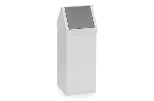 Praktisk och robust avfallsbehållare i plåt. Pulverlackerad i en mycket tålig strukturlack, grå RAL 7037. Vippbart lock ifrån båda sidor. Enkel tömning med avtagbar överdel.