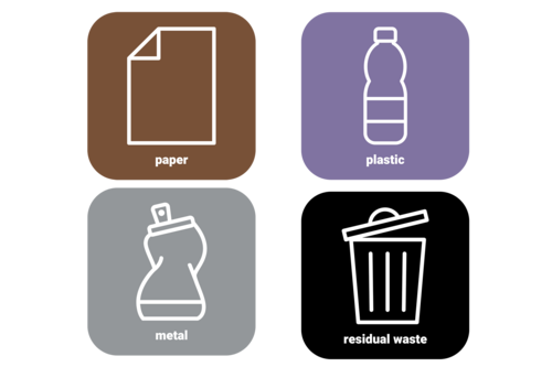 Dekalset för sorteringsvagn. Flyttbara klisterdekaler som går att placera både på vagnen och kärlen. Varje dekal är 100x100 mm. Designade för att användas tillsammans med vår sorteringsvagn för att skapa en flexibel återvinningsstation.