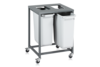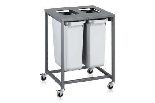 Sorteringsvagn för hantering och sortering av avfall på industri och lager. Fungerar alldeles utmärkt för sortering av diverse olika material och är användbar inom många olika områden. Flexibel att manövrera tack vare dess avskalade design och låga vikt. Vagnen är tillverkad i en enkel rörkonstruktion med toppskiva i lackerad plåt och utrustad med fyra 75 mm länkhjul, varav två med broms. Den här varianten har två lösa kärl som är tillverkade i återanvänd plast, dessa har en volym på 60 liter styck och kan användas både med och utan sopsäck. Kärlen har stora handtag för smidig hantering vid förflyttning. Flyttbara dekaler för montering på toppskivan eller kärlen ingår.