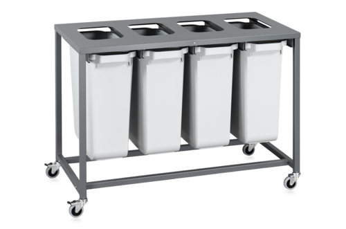 Sorteringsvagn för hantering och sortering av avfall på industri och lager. Fungerar alldeles utmärkt för sortering av diverse olika material och är användbar inom många olika områden. Flexibel att manövrera tack vare dess avskalade design och låga vikt. Vagnen är tillverkad i en enkel rörkonstruktion med toppskiva i lackerad plåt och utrustad med fyra 75 mm länkhjul, varav två med broms. Den här varianten har fyra lösa kärl som är tillverkade i återanvänd plast, dessa har en volym på 60 liter styck och kan användas både med och utan sopsäck. Kärlen har stora handtag för smidig hantering vid förflyttning. Flyttbara dekaler för montering på toppskivan eller kärlen ingår.