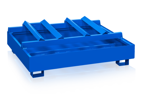 Robust konstruktion i plåt för att klara av truckhantering. Fatpallen är pulverlackad i blå färg. För enklare hantering kan fatpallen utrustas med 150 mm nylonhjul.