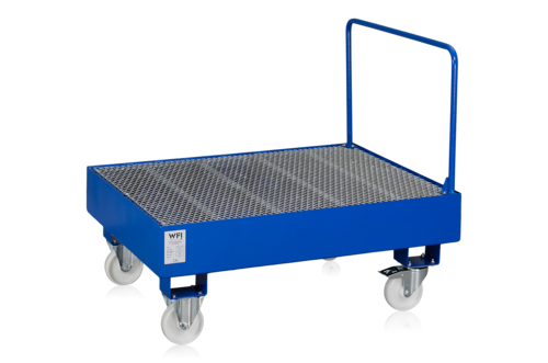 Fatpall med hjul för 2 fat. Uppsamlingskapacitet på 240 l. Med fatpallen hindrar du eventuellt läckage från att rinna ut då det samlas upp i pallen. Robust konstruktion i plåt för att klara av truckhantering. Fatpallen är pulverlackad, med galvaniserad sträckmetall som faten står på. Den här varianten är utrustad med handtag och nylonhjul för enklare hantering och förflyttning av avfall. Nylonhjulen är slitstarka, tål hög belastning och lämnar inga märken på underlaget, hjulsatsen består av två fixerade och två låsbara länkhjul.
