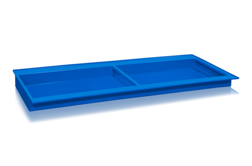 Anpassade för 3 europallar. Samlar säkert upp eventuellt läckage av oljor eller kemikalier och fungerar därmed som uppsamlingskärl för pallar. Pulverlackerad i blå RAL 5005 och säkrad med tätningsmassa. Utan galler, avsedda att placeras på balkarna i ett pallställ.
