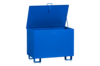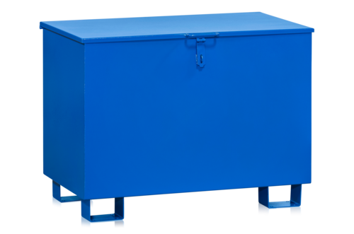 Verktygscontainer i kraftig stålplåt för förvaring av verktyg på industrier och byggarbetsplatser. Gaffeluttag för smidig truckhantering. Pulverlackerade i rostskyddsfärg vilket gör att den kan förvaras utomhus. Färg blå RAL 5005.