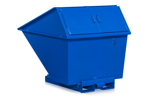 Stabil tippcontainer med lock för effektiv materialhantering och källsortering. Passar för till exempel emballage-, metall-, trä- och sopavfall. Den är tillverkad helsvetsad stålplåt. Front, bakstycke och botten har 2,5 mm plåt medan sidorna har 2 mm tjocklek. Ytan är pulverlackerad (blå RAL 5005) för en hållbar och stryktålig finish. C/c gaffelhål 395 mm och gaffelhål 225x95 mm.