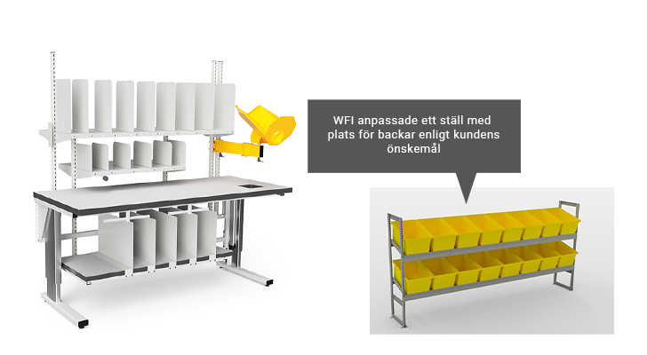 Vi anpassade även ett ställ med plats för backar. Backstället fungerar som en logistikstation och hanterar inkommande försändelser och ska kunna skicka hela backen vidare för annan destination.