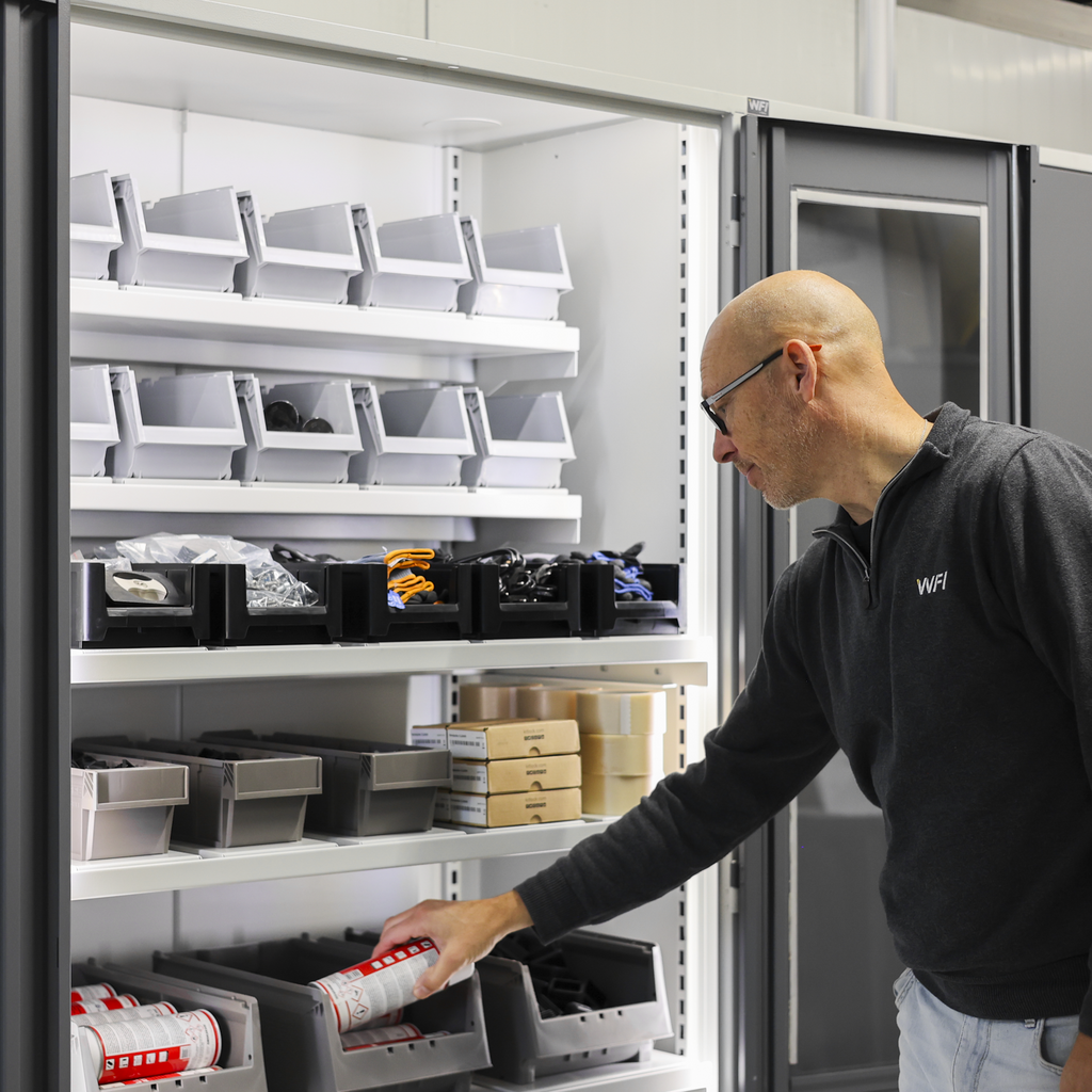 Tillsammans med senseStock lanserar vi på WFI en helt ny produkt i vårt sortiment – smarta skåp med automatiserad inventering. Lösningen bygger på vårt klassiska verkstadsskåp med vitrindörrar som utrustas med senseStocks vågelement och sensorer. Ett system som registrerar hur mycket material som finns på lagerplatsen, ger en heads up på när det är dags att beställa mer och dessutom kan sköta beställningen i ett helt automatiserat flöde. Smart va?