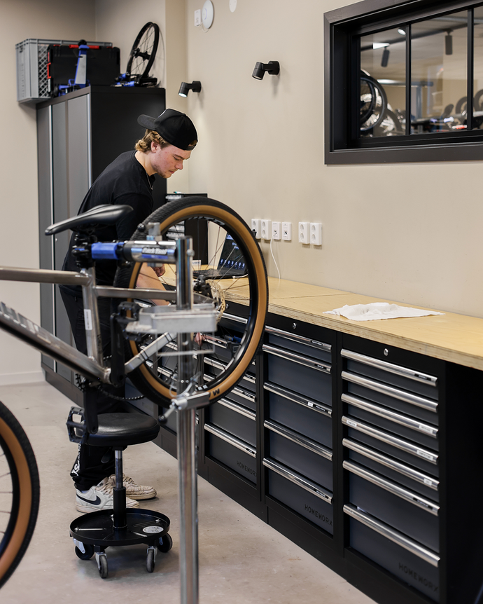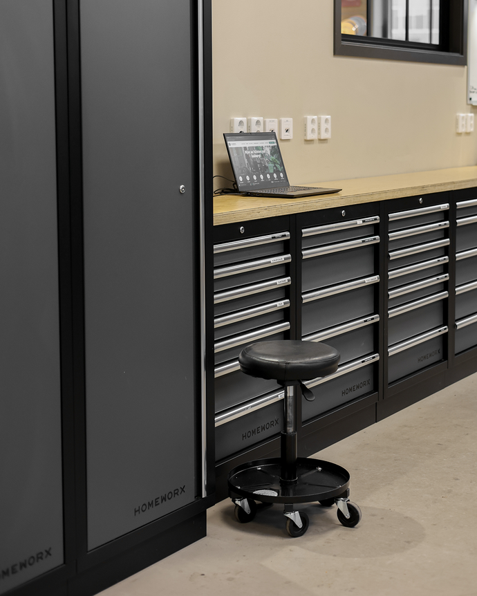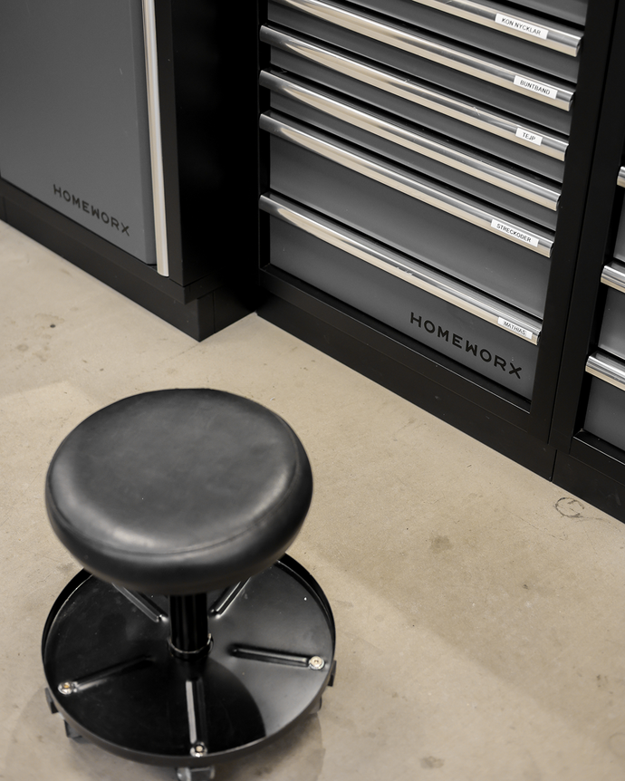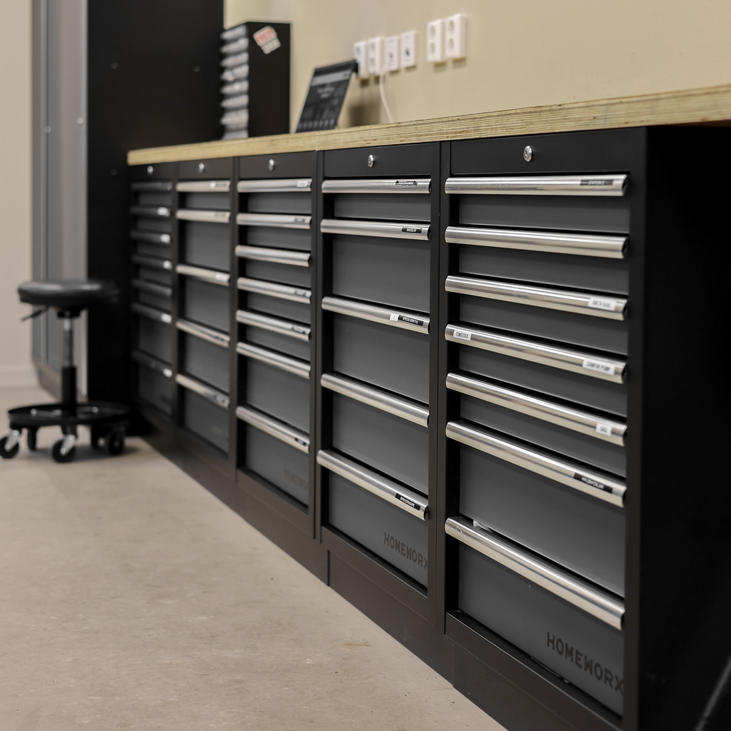 Med hela fem stycken underskåp, både med fem och sju lådor, skapas stora förvaringsmöjligheter för verktyg i cykelverkstaden. När underskåpen placeras på rad och kombineras med en bänkskiva blir det även en utmärkt arbetsyta för mängder av arbetsuppgifter. Win-win! Alla våra underskåp med lådor har kullagrade expansioner och är fullt utdragbara.