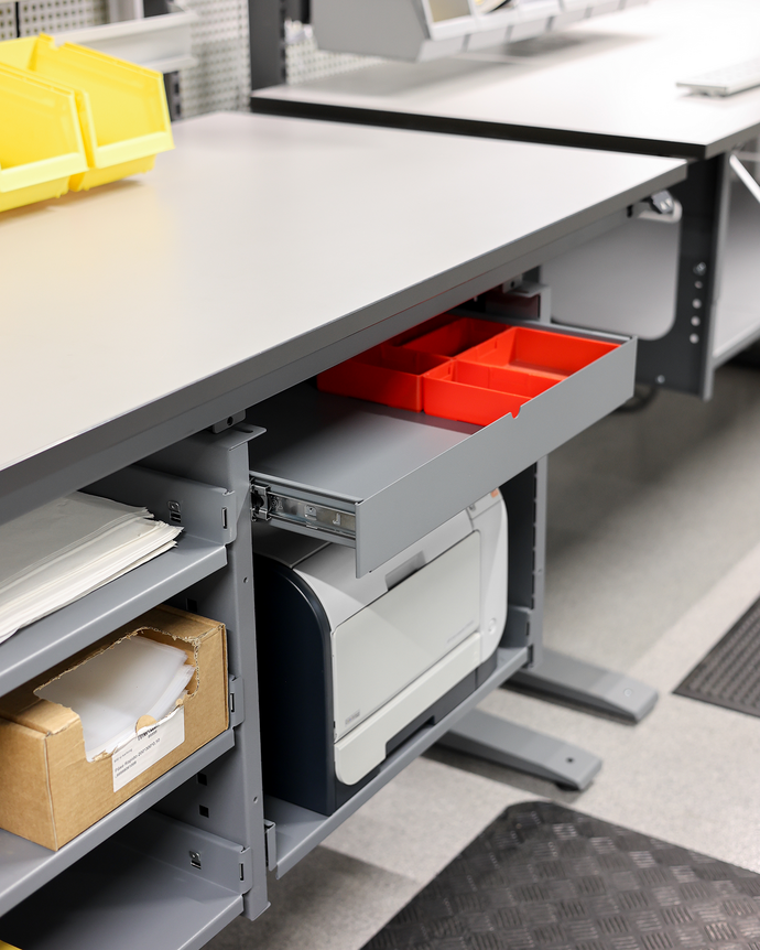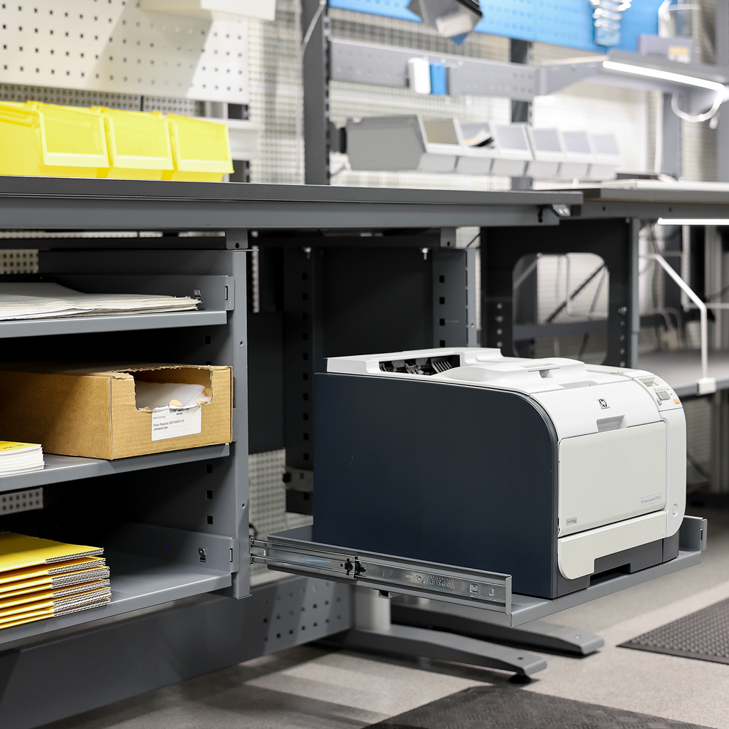 Något som ofta tar upp onödig plats och kan förvaras på ett smartare sätt? Skrivare. Placera hyllplanet på den lägsta höjden för att skapa ett stort utrymme där skrivaren får plats. Eftersom hyllplanet är fullt utdragbart blir det lika enkelt att hantera materialet, samtidigt som det blir mer bordsyta över till annat!