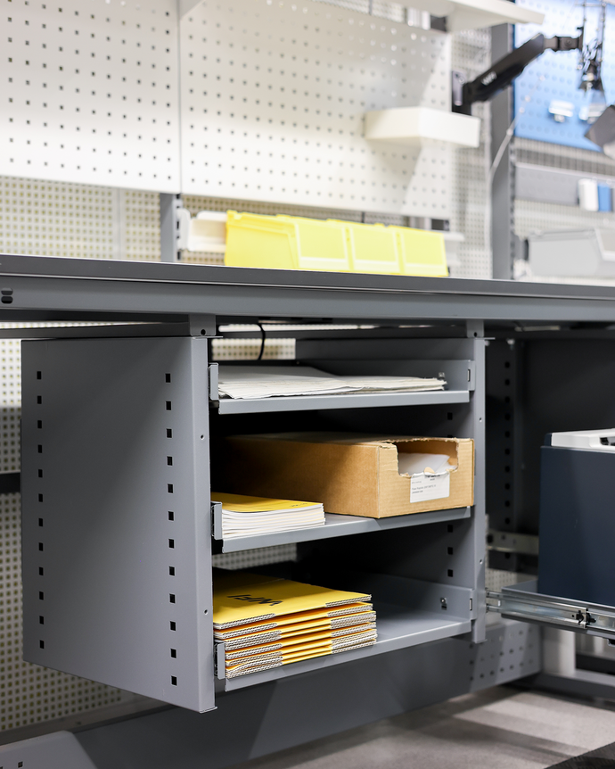 Ta tillvara på förvaringsutrymmet under arbetsbordet med vår nya underhylla! En smart konstruktion utgör basen till fyra kompletta varianter med olika typer av inredning. Samtliga består av konsoler som monteras på ramen under bordet och fullt utdragbara hyllplan med expansioner. Hyllplanen går även att komplettera med lådfronter för att skapa en annan typ av förvaring – smart och enkelt.