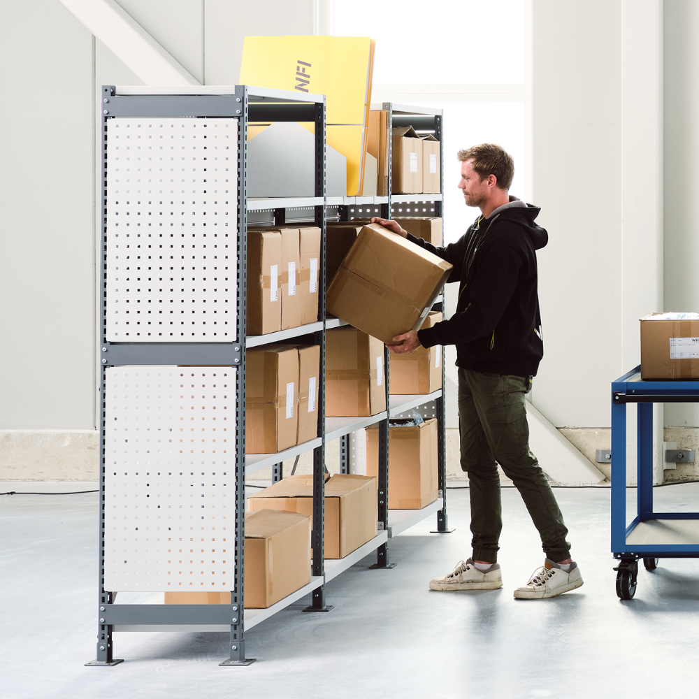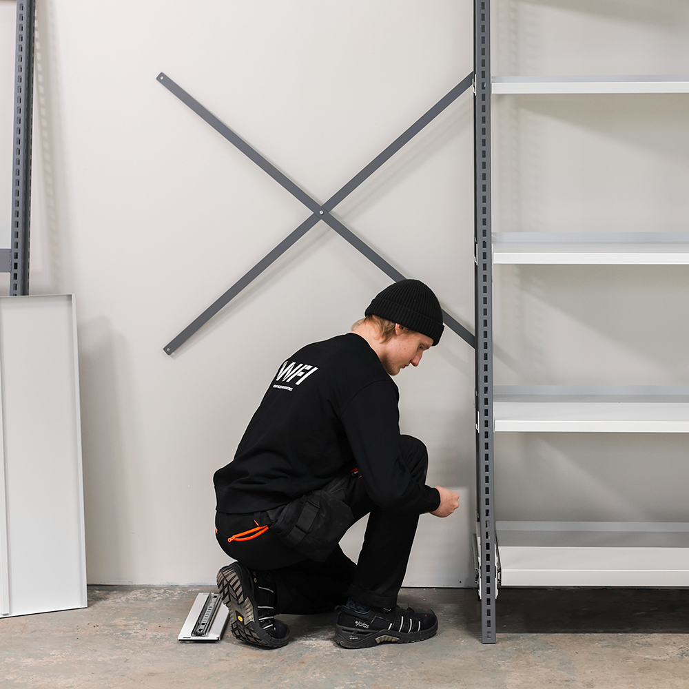 Vårt hyllsystem är ett riktigt stabilt och modulärt system som går att anpassa med mängder av tillbehör, olika typer av hyllplan och obegränsat antal följesektioner. Här finns det möjlighet att välja bland fasta hyllor, utdragbara hyllor och lådor, trådhyllor med dropptråg och avdelare. Utöver att det går att bygga ett omfattande system är det också möjligt att inkludera ett komplett arbetsbord i samma lösning, platseffektivt och flexibelt.