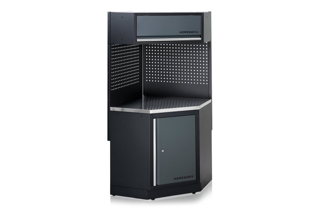 För att komplettera vårt sortiment av garageinredning och skapa fler möjligheter att bygga fritt lanserar vi även en ny hörnmodul. Hörnmodulen är komplett med ett överskåp, två perforerade paneler, toppskiva i rostfri plåt eller plywood och ett underskåp. Underskåpet har ett flyttbart hyllplan inuti och en låsbar dörr med två nycklar, överskåpet öppnas med gasfjäder. Ett perfekt komplement för att utöka förvaringen i garaget och ta vara på hörnytan i rummet.