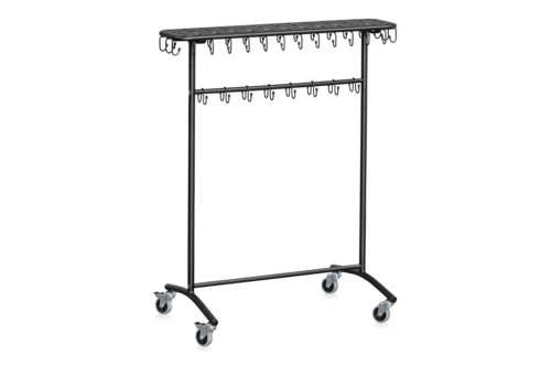 Funktionell klädvagn med 46 fasta krokar för smart upphängning av kläder i kapprum eller omklädningsrum. Klädvagnen kan snabbt och enkelt frigöra plats i kapprummet genom att rullas till angränsade förvaringsrum. Vagnen är utrustad med fyra länkhjul, varav två är låsbara.
