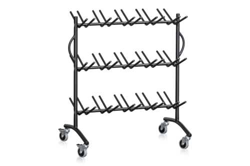 Funktionell stövelvagn för smart upphängning av blöta skor och stövlar i kapprum. Stövelvagnen kan snabbt och enkelt frigöra plats i kapprummet genom att rullas till angränsade förvaringsrum eller torkskåp. Plats för 30 par stövlar eller skor. Vagnen är utrustad med fyra länkhjul, varav två är låsbara.