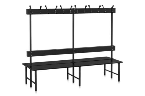 Stabil och fristående sittbänk som passar utmärkt för omklädningsrum eller kapprum. Den här varianten är en dubbelsektion med tillhörande kroklist för möjlighet till upphängning. Sittbänken har bänkbrädor, ryggbräda och kroklist i melamin och ett underrede som är pulverlackerat svart. Bänken har en sitthöjd på 430 mm och ett sittdjup på 365 mm, totalhöjd 1600 mm.