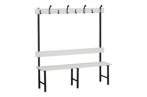 Stabil och fristående sittbänk som passar utmärkt för omklädningsrum eller kapprum. Den här varianten är en enkelsektion med tillhörande kroklist för möjlighet till upphängning. Sittbänken har bänkbrädor, ryggbräda och kroklist i melamin och ett underrede som är pulverlackerat svart. Bänken har en sitthöjd på 430 mm och ett sittdjup på 365 mm, totalhöjd 1600 mm.