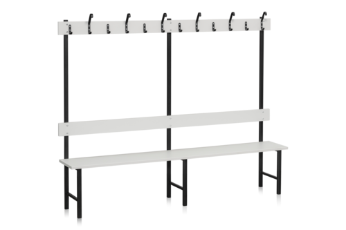 Stabil och fristående sittbänk som passar utmärkt för omklädningsrum eller kapprum. Den här varianten är en enkelsektion med tillhörande kroklist för möjlighet till upphängning. Sittbänken har bänkbrädor, ryggbräda och kroklist i melamin och ett underrede som är pulverlackerat svart. Bänken har en sitthöjd på 430 mm och ett sittdjup på 365 mm, totalhöjd 1600 mm.