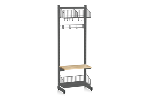 L-stativ (bassektion) till vårt golvstående förvaringssystem. Komplettera med tilläggssektioner, olika typer av hyllplan, perforerade paneler och krokar för att skapa en funktionell förvaringslösning för alla typer av miljöer, exempelvis kapprum.