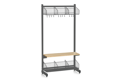 L-stativ (bassektion) till vårt golvstående förvaringssystem. Komplettera med tilläggssektioner, olika typer av hyllplan, perforerade paneler och krokar för att skapa en funktionell förvaringslösning för alla typer av miljöer, exempelvis kapprum.