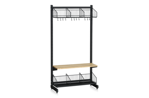 L-stativ (bassektion) till vårt golvstående förvaringssystem. Komplettera med tilläggssektioner, olika typer av hyllplan, perforerade paneler och krokar för att skapa en funktionell förvaringslösning för alla typer av miljöer, exempelvis kapprum.