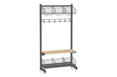 L-stativ (bassektion) till vårt golvstående förvaringssystem. Komplettera med tilläggssektioner, olika typer av hyllplan, perforerade paneler och krokar för att skapa en funktionell förvaringslösning för alla typer av miljöer, exempelvis kapprum.