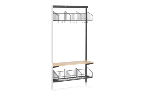 Vägghängd sko- och hatthylla inklusive sittbänk (tilläggssektion) för förvaring av kläder och skor. Hyllan går att bygga ut med fler sektioner till ett helt hyllsystem som både har stort förvaringsutrymme och är platsbesparande. Perfekt för att skapa funktionella förvaringslösningar för exempelvis kapprum. Sko- och hatthyllan har tre fack vardera och en dropplåt som samlar upp smuts.
