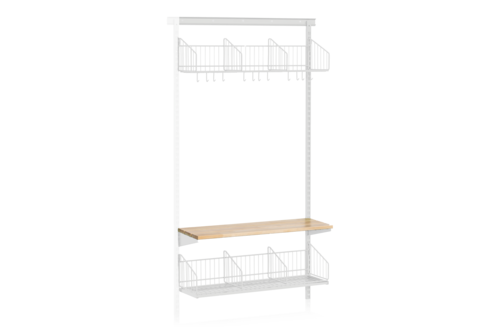 Vägghängd sko- och hatthylla inklusive sittbänk (tilläggssektion) för förvaring av kläder och skor. Hyllan går att bygga ut med fler sektioner till ett helt hyllsystem som både har stort förvaringsutrymme och är platsbesparande. Perfekt för att skapa funktionella förvaringslösningar för exempelvis kapprum. Sko- och hatthyllan har tre fack vardera och en dropplåt som samlar upp smuts.