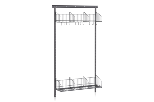 Vägghängd sko- och hatthylla (bassektion) för förvaring av kläder och skor. Hyllan går att bygga ut med fler tilläggssektioner till ett helt hyllsystem som både har stort förvaringsutrymme och är platsbesparande. Perfekt för att skapa funktionella förvaringslösningar för exempelvis kapprum. Sko- och hatthyllan har tre fack vardera och en dropplåt som samlar upp smuts.