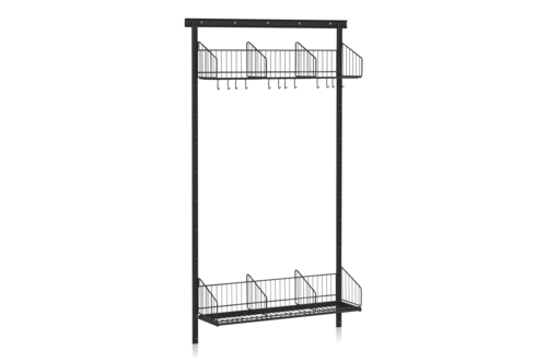 Vägghängd sko- och hatthylla (bassektion) för förvaring av kläder och skor. Hyllan går att bygga ut med fler tilläggssektioner till ett helt hyllsystem som både har stort förvaringsutrymme och är platsbesparande. Perfekt för att skapa funktionella förvaringslösningar för exempelvis kapprum. Sko- och hatthyllan har tre fack vardera och en dropplåt som samlar upp smuts.