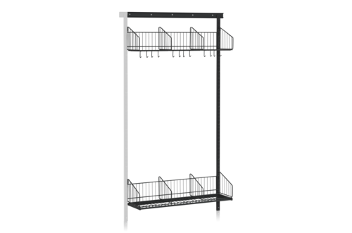 Vägghängd sko- och hatthylla (tilläggssektion) för förvaring av kläder och skor. Hyllan går att bygga ut med fler sektioner till ett helt hyllsystem som både har stort förvaringsutrymme och är platsbesparande. Perfekt för att skapa funktionella förvaringslösningar för exempelvis kapprum. Sko- och hatthyllan har tre fack vardera och en dropplåt som samlar upp smuts.