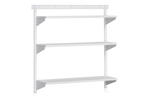 Vägghylla med tre hyllplan (tilläggssektion) som går att bygga ut till ett vägghängt hyllsystem med fler sektioner. Här finns det möjlighet att bygga ett hyllsystem som både har stort förvaringsutrymme och är platsbesparande. Lastkapacitet varierar beroende på väggkonstruktion och infästning.