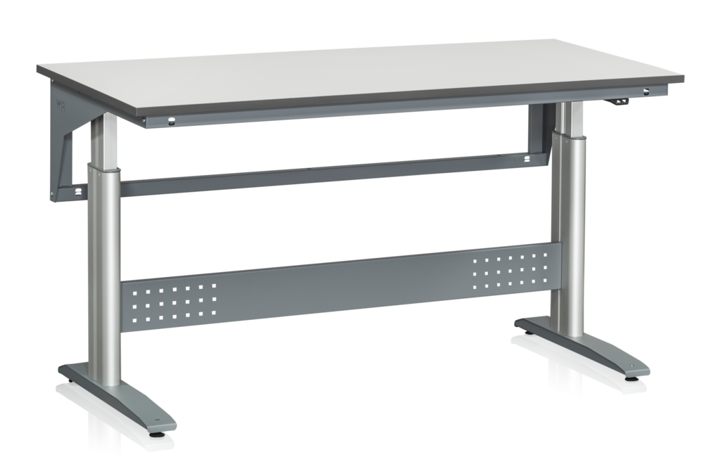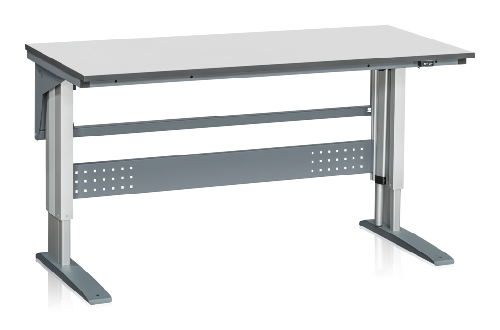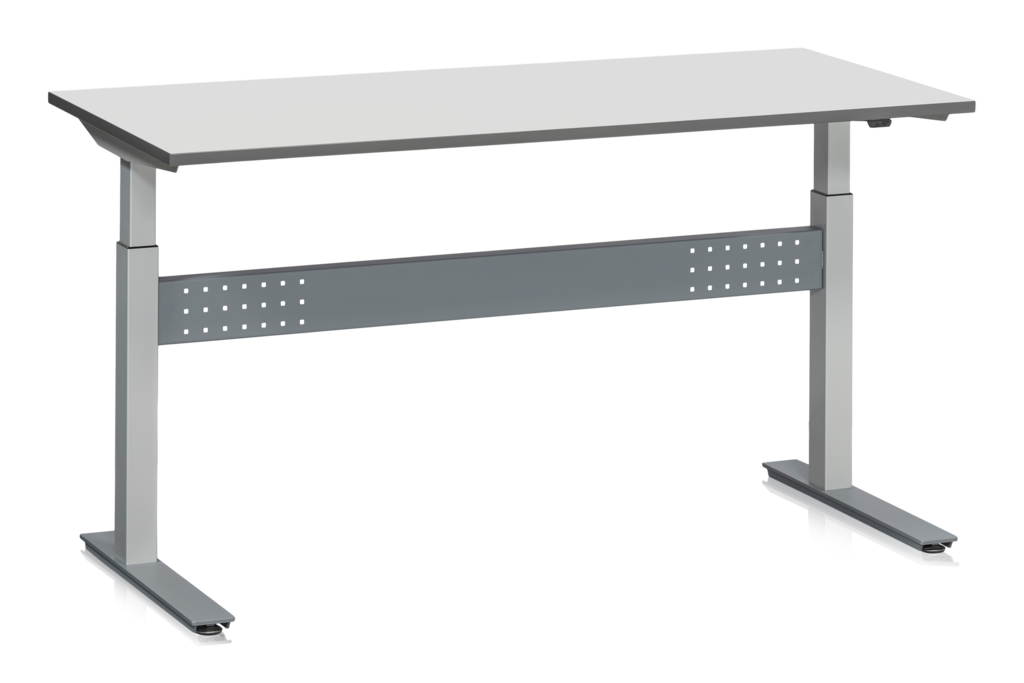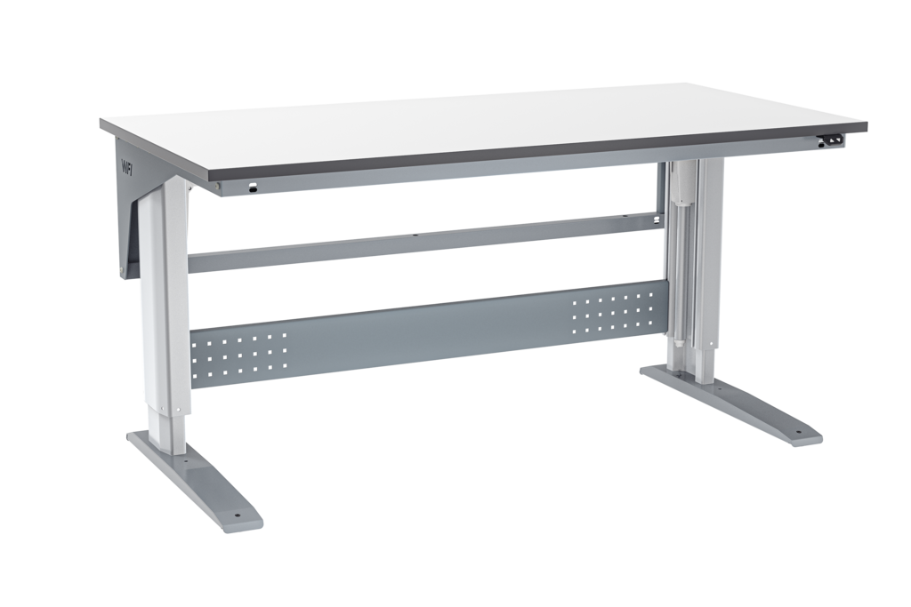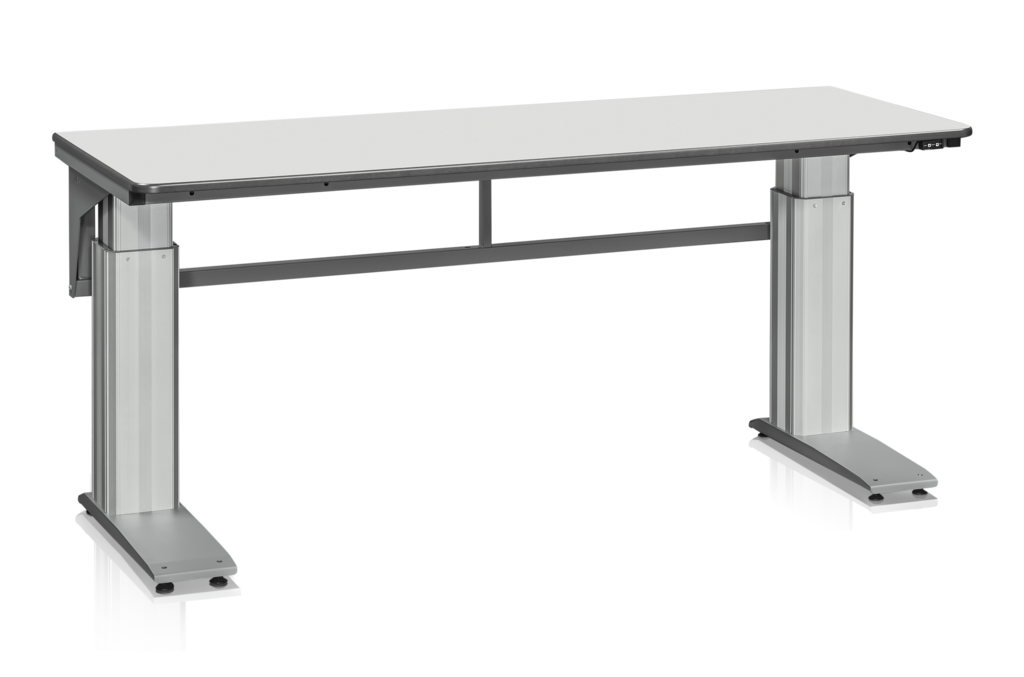 Motoriserat arbetsbord med fyra pelare som skapar ett riktigt stabilt bord, anpassat för arbeten som kräver en hållfast och stadig arbetsyta.